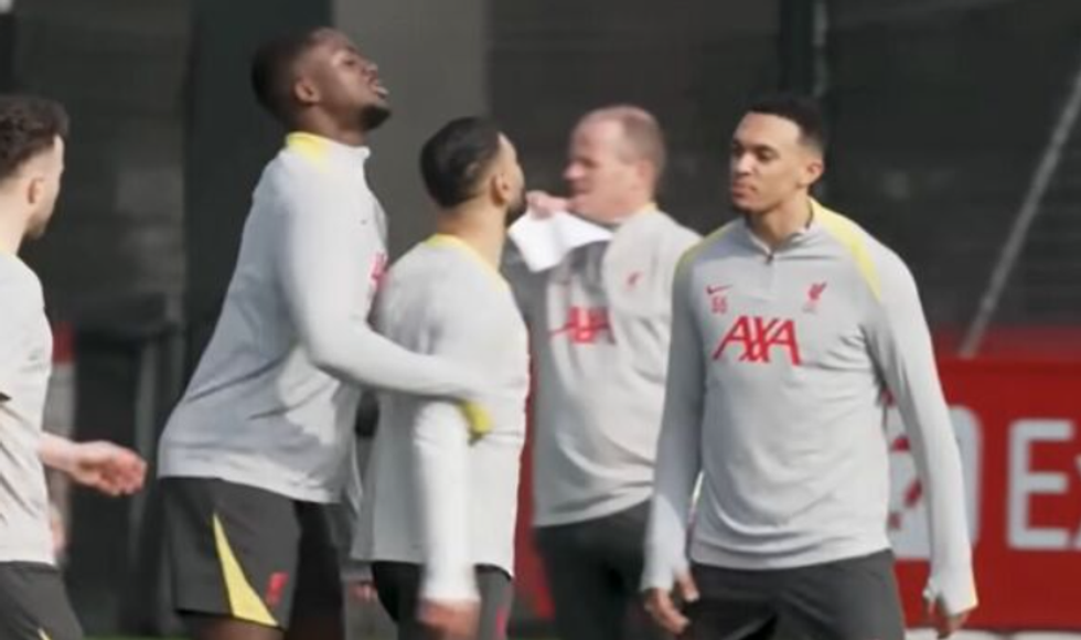 Harvey Elliott dhe Ibrahima Konate i ndanë, me Salah duke qeshur gjatë gjithë incidentit ndërsa Alexander-Arnold dukej më i irrituar.