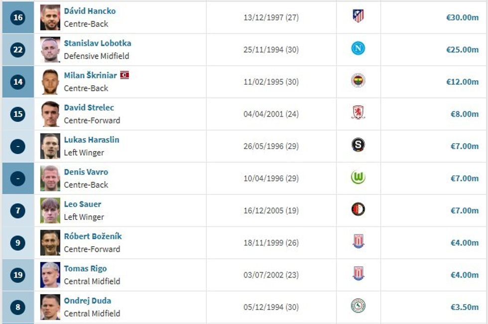 Hanco ka një vlerë prej 30 milionë eurosh, Lobotka vlerë prej 25 milionë eurosh, Skrianiar me vlerë 12 milionë euro dhe David Strelec me vlerë 8 milionë euro.