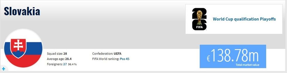 Vlera e përgjithshme e kombëtares sllovake sipas faqes së specializuar të transferimeve dhe statistikave Transfermarkt është rreth 138 milionë euro.