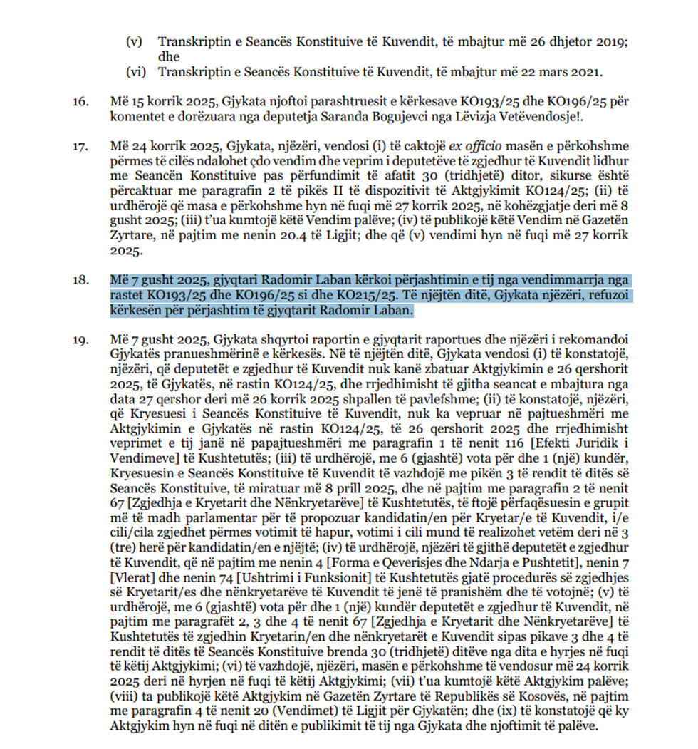 “Më 7 gusht 2025, gjyqtari Radomir Laban kërkoi përjashtimin e tij nga vendimmarrja nga rastet KO193/25 dhe KO196/25 si dhe KO215/25. Të njëjtën ditë, Gjykata njëzëri, refuzoi kërkesën për përjashtim të gjyqtarit Radomir Laban”, thuhet në aktgjykimin e Kushtetueses.