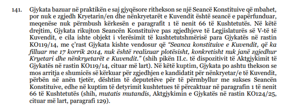 "Në këto rrethana, deputetët e zgjedhur të Kuvendit duhet të konstituojnë Kuvendin brenda afatit të mbetur prej 12 (dymbëdhjetë) ditëve, gjithnjë duke respektuar procedurën e përcaktuar me Kushtetutë dhe Rregulloren e Kuvendit. Gjykata rikujton obligimin e deputetëve që të marrin pjesë në punimet e Kuvendit, duke përfshirë edhe pjesëmarrjen e tyre në votim, përkitazi me propozimet e paraqitura në bazë të Kushtetutës dhe rregullave tjera të ndërlidhura", thuhet në aktgjykim. /Telegrafi/