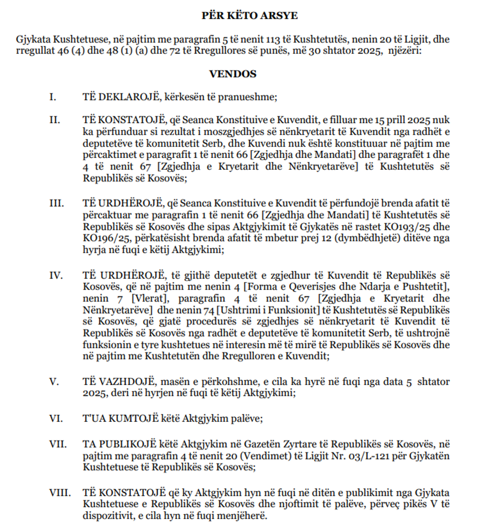 Gjykata ka konstatuar se seanca konstituive e Kuvendit, e filluar me 15 prill 2025 nuk ka përfunduar si rezultat i moszgjedhjes së nënkryetarit të Kuvendit nga radhët e deputetëve të komunitetit serb, dhe Kuvendi nuk është konstituuar në pajtim me përcaktimet e paragrafit 1 të nenit 66 [Zgjedhja dhe Mandati] dhe paragrafët 1 dhe 4 të nenit 67 [Zgjedhja e Kryetarit dhe Nënkryetarëve] të Kushtetutës së Republikës së Kosovës.