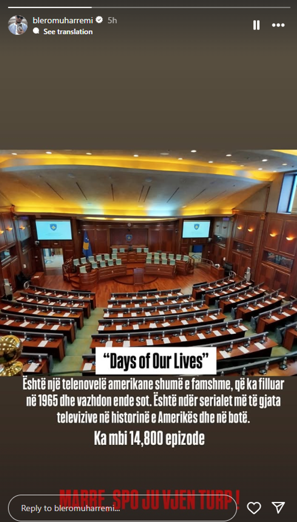 “‘Days of Our Lives’, është një telenovelë amerikane shumë e famshme që ka filluar në 1965 dhe vazhdon ende sot. Është ndër serialet më të gjata televizive në historinë e Amerikës dhe në botë. Ka mbi 14.800 episode”, ka thënë ai.