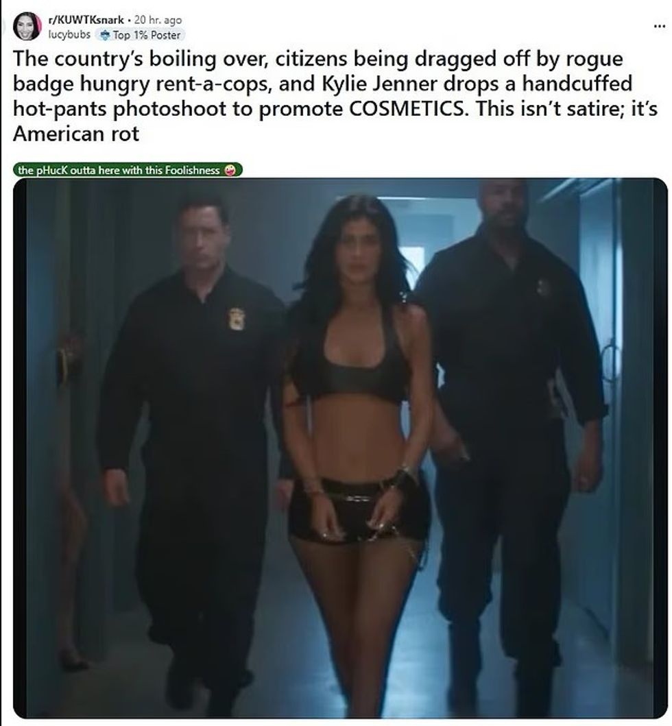 Të tjerë e cilësuan klipin “provokim të panevojshëm” dhe “manipulim të çuditshëm” në një kohë kur, siç shkroi një përdorues, “ICE po rrëmben njerëz dhe Kylie po përdor uniformat e policisë si estetikë për marketing”. Një tjetër shtoi: “Pse po e përdor sistemin e burgut si element mode? Kjo është mungesë totale ndjeshmërie”.