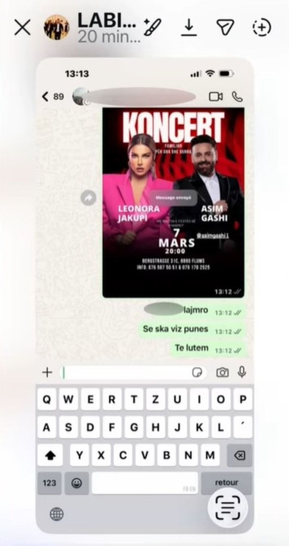 Në materialin e transmetuar janë publikuar edhe disa mesazhe që pretendohet se janë dërguar nga Rexha si përgjigje ndaj një “story” në Instagram ku Jakupi paralajmëronte një koncert për 7 Mars, ku ai i shkruante: “Ishalla ke vizë pune”.