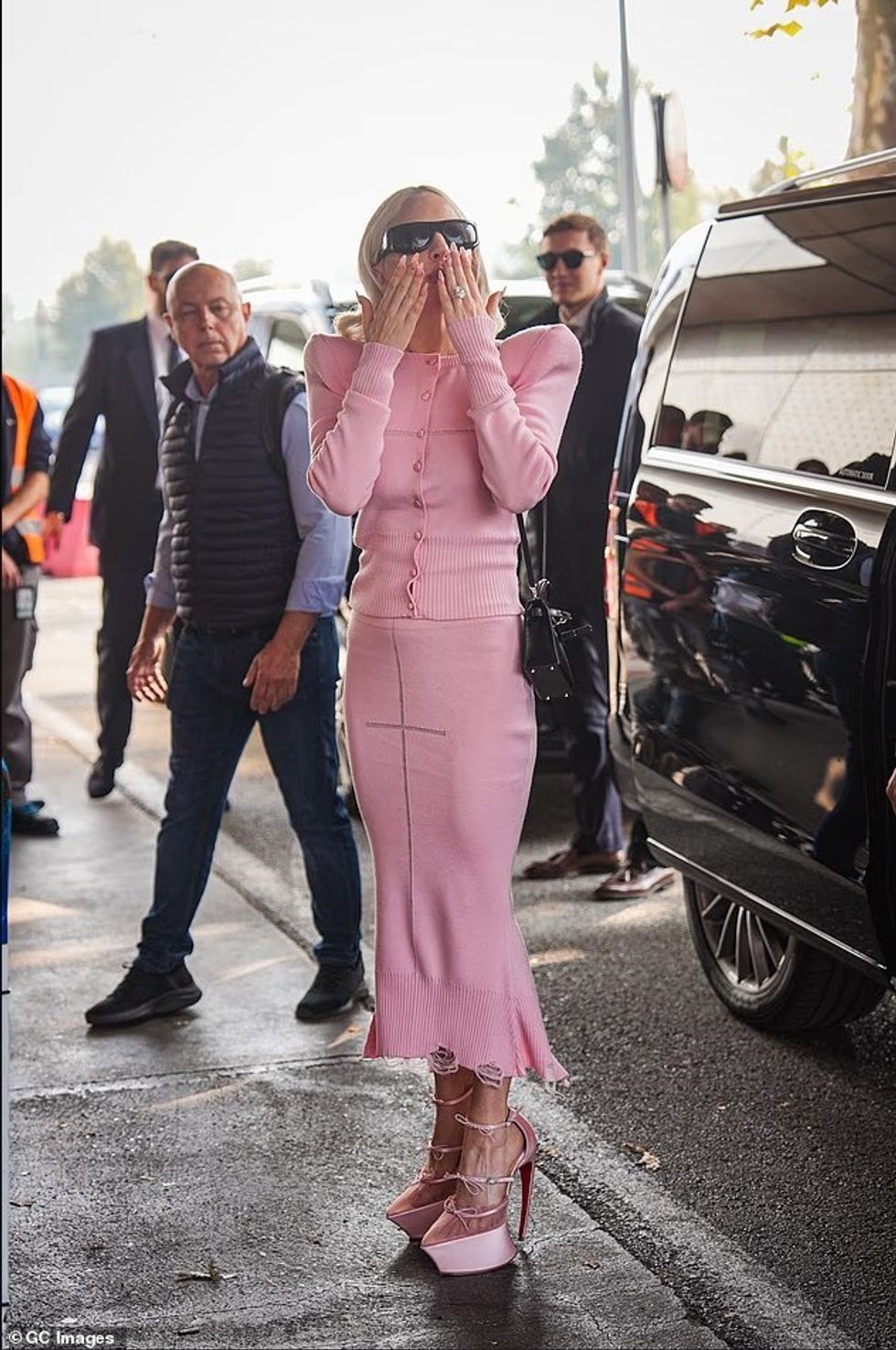 Ylli 39-vjeçar ishte e veshur me një kostum rozë të bebeve, i përbërë nga xhaketë me kopsa dhe mbrojtëse shpatullash, dhe fund midi të përputhur, të kombinuara me këpucë unike me taka dhe syze dielli të zeza.