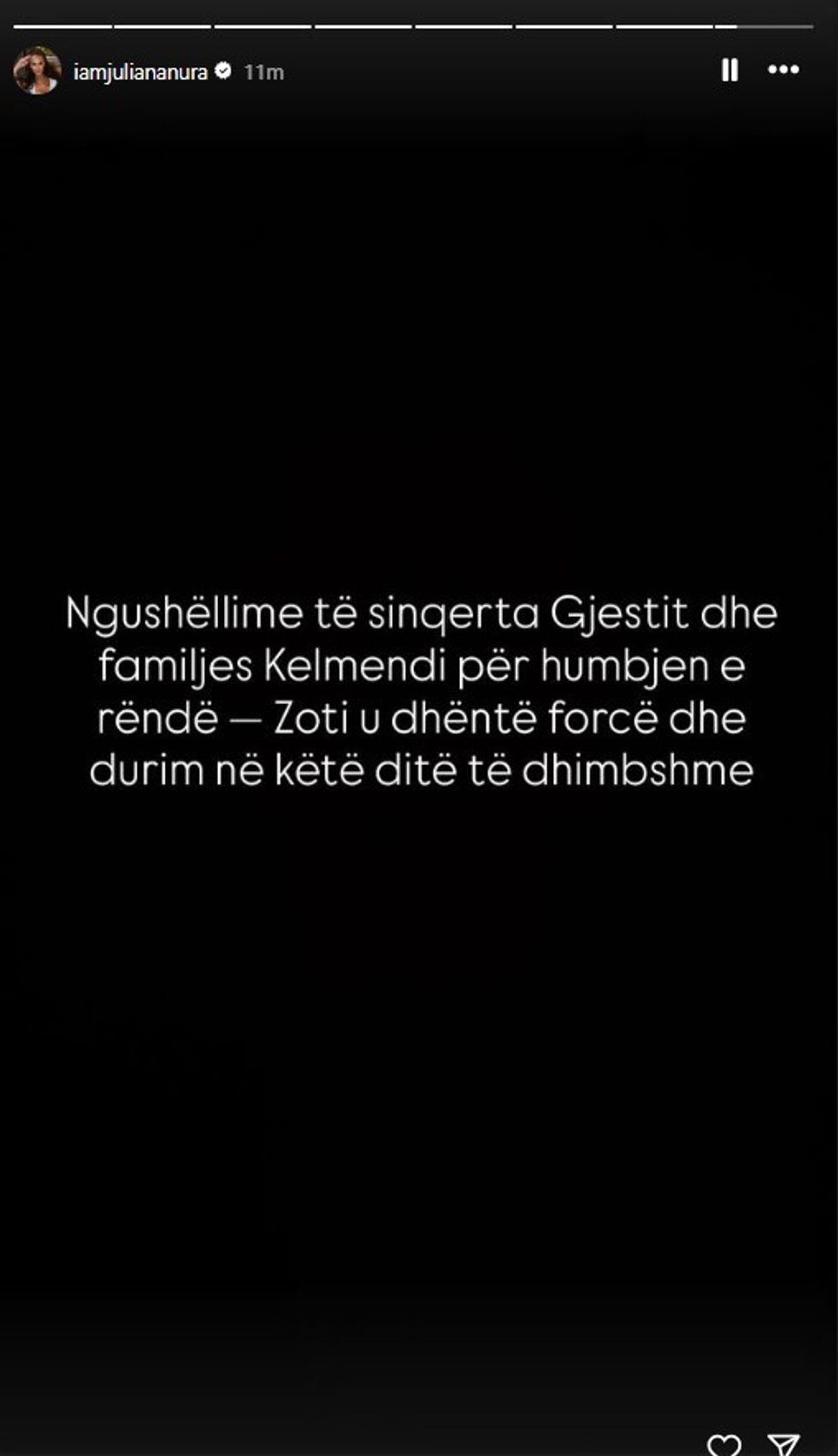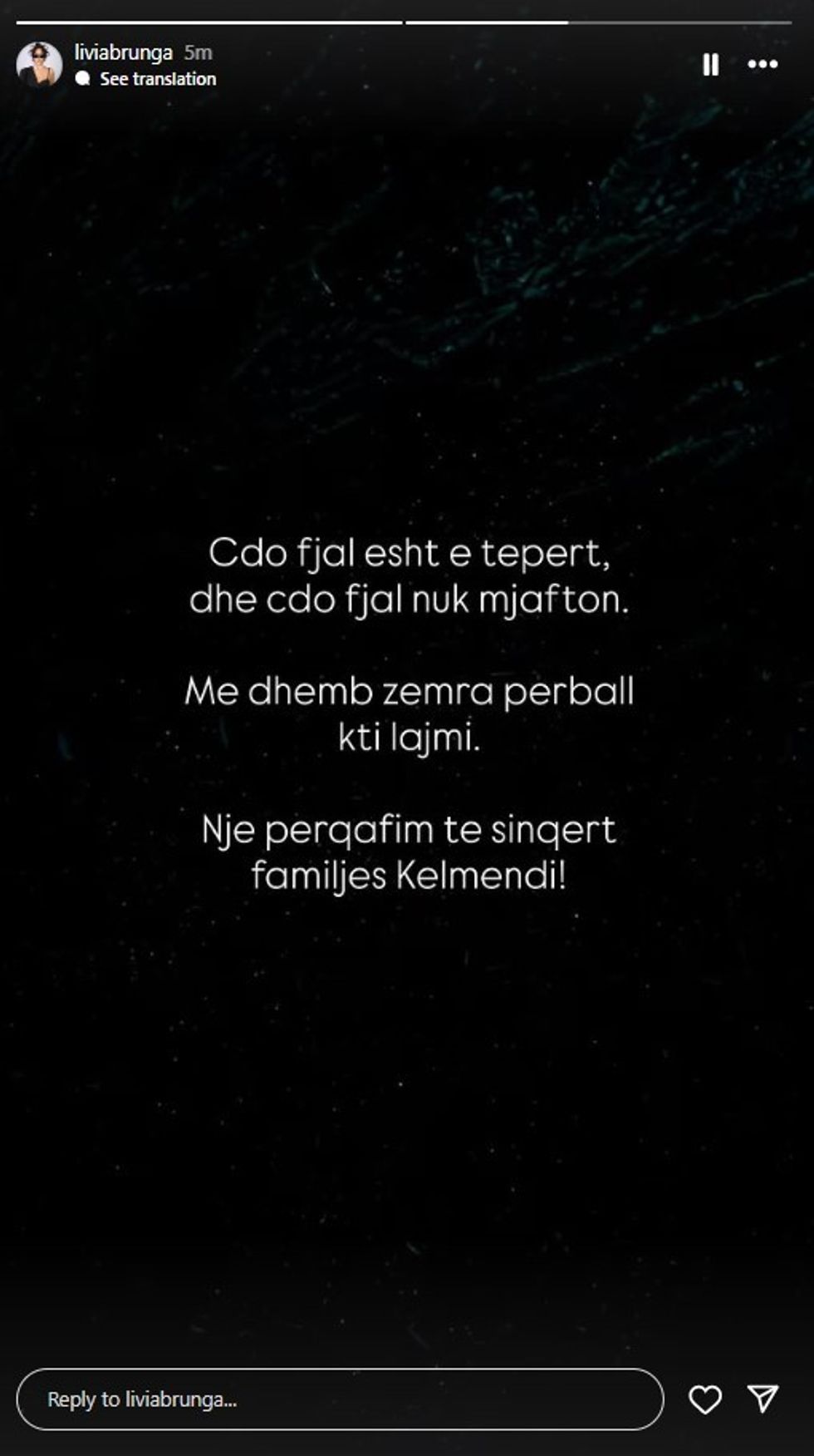 “Çdo fjalë është e tepërt, dhe çdo fjalë nuk mjafton. Më dhemb zemra përballë këtij lajmi. Një përqafim të sinqertë familjes Kelmendi!”.