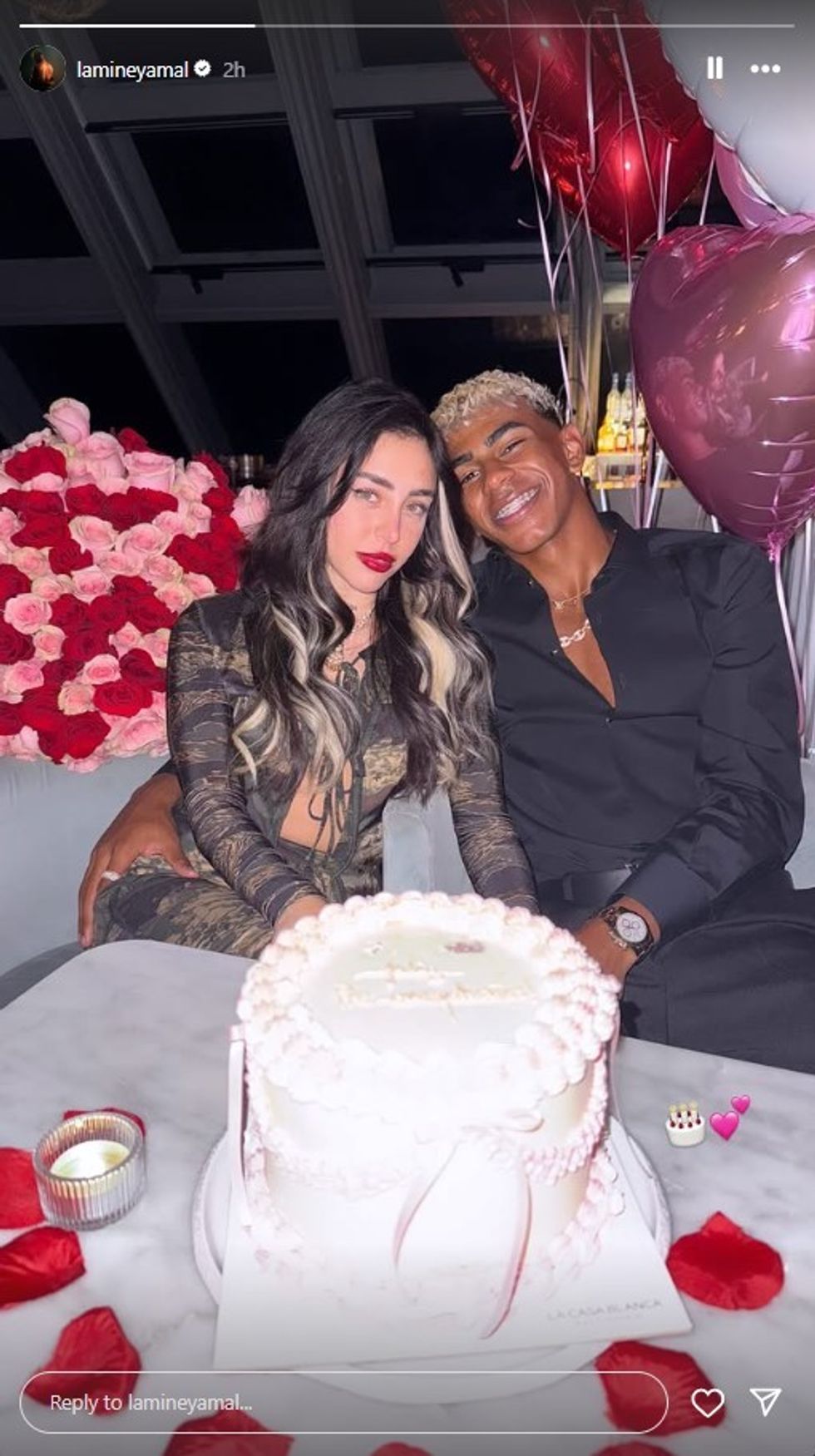 Në imazh, Yamal shihet duke e mbajtur Nicole nga beli, ndërsa përpara tyre qëndron një tortë e madhe e rrethuar nga petale trëndafilash.