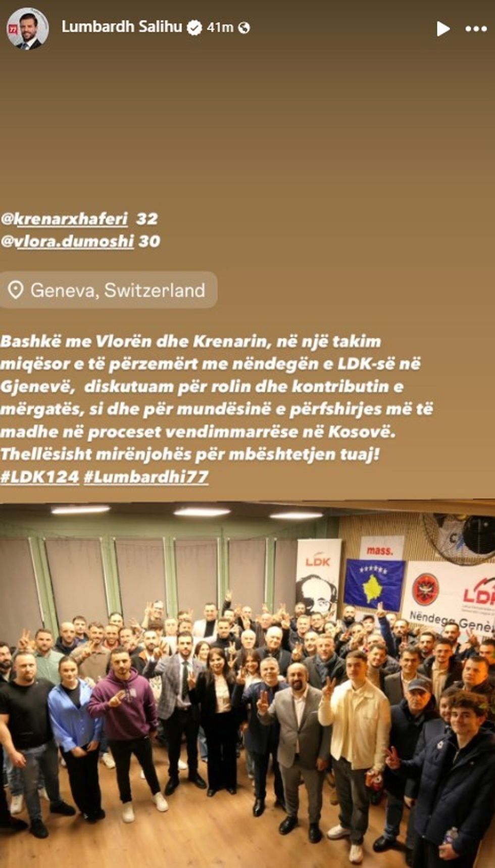 "Bashkë me Vlorën dhe Krenarin, në një takim miqësor e të përzemërt me nëndegën e LDK-së në Gjenevë, diskutuam për rolin dhe kontributin e mërgatës, si dhe për mundësinë e përfshirjes më të madhe në proceset vendimmarrëse në Kosovë. Thellësisht mirënjohës për mbështetjen tuaj!", ka shkruar Salihu.