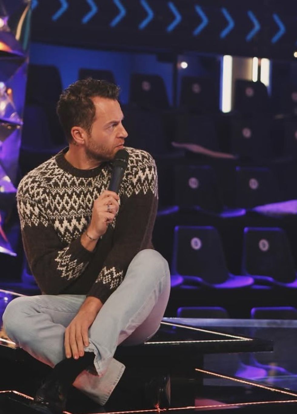 Në imazhet e publikuar, Ledioni shihet në skenë, i veshur thjesht dhe në mënyrë të rehatshme, teksa bën prova dhe përgatitje teknike për moderimin.