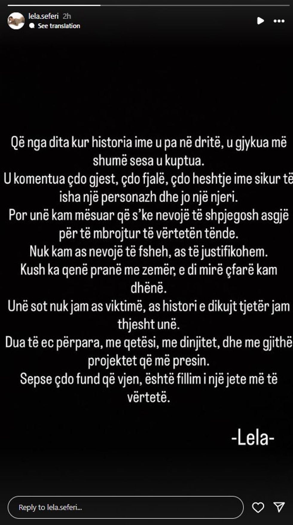 Në shkrimin e saj, Lela tregon se ndonëse është komentuar dhe gjykuar shumë, ajo ka mësuar të mos ketë më nevojë të shpjegojë apo të justifikohet për asgjë.