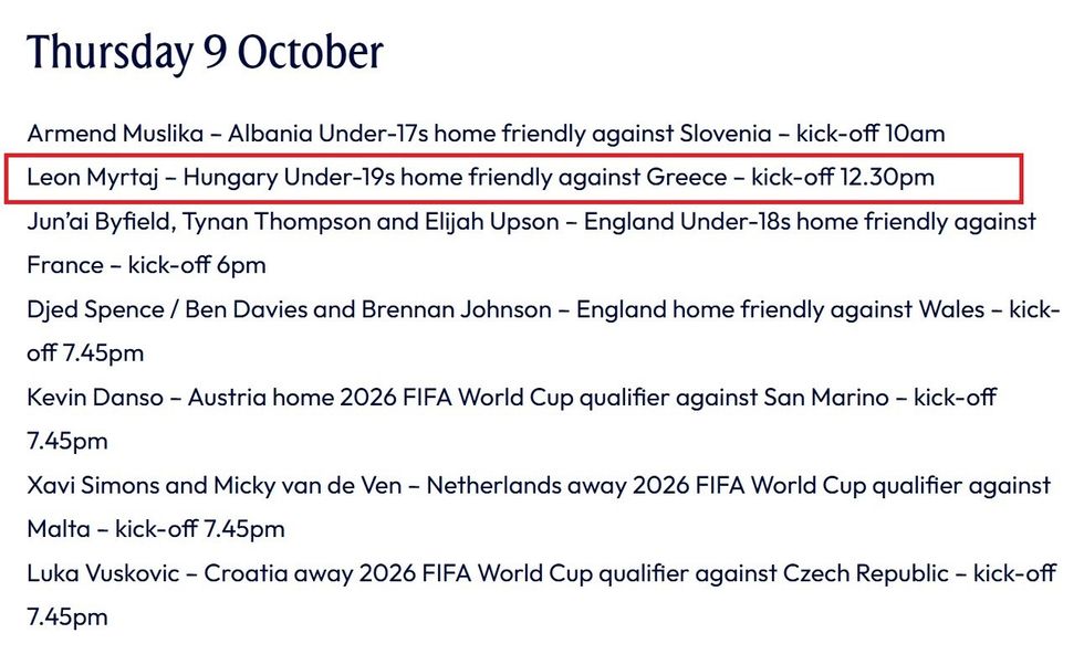 “Ndërkohë, lojtari tjetër i Akademisë, Leon Myrtaj, bashkohet me Hungarinë U-19 vjeç për herë të parë, pasi më parë kishte përfaqësuar Shqipërinë në nivelin e të rinjve”, thuhet në njoftimin e Tottenhamit.