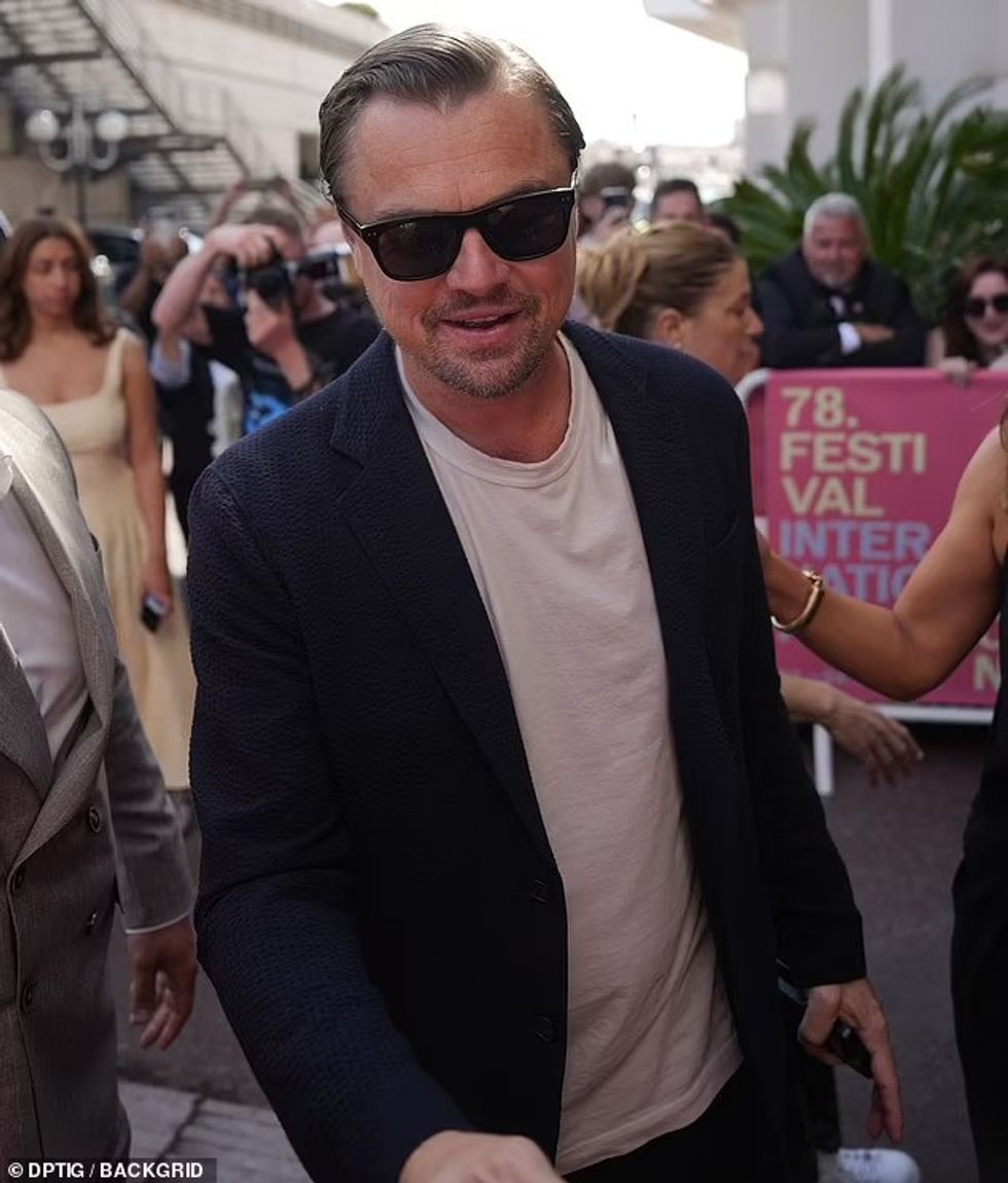 Leo dukej tejet i hijshëm teksa kalonte përmes turmës, i veshur me një xhaketë blu navy mbi një bluzë të bardhë.