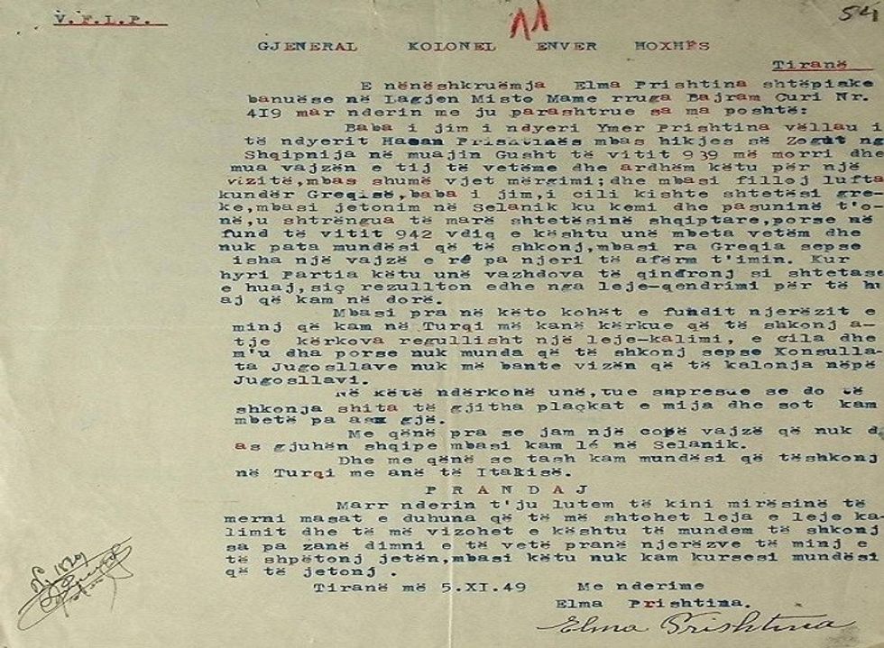 Një dokument i rrallë i vitit 1949, rikthen në vëmendje historinë tronditëse të Elma Prishtinës, mbesës së personalitetit të njohur, ish-kryeministrit të Shqipërisë, patriotit të njohur, Hasan Prishtina. E bllokuar në Shqipëri pa familje, pa pasuri dhe pa të drejtë largimi, Elma i shkroi personalisht kryeministrit Enver Hoxha, një letër të gjatë dhe të dhimbshme, duke kërkuar vetëm një gjë: të largohej nga vendi ku nuk kishte asnjë njeri dhe ku nuk mund të mbijetonte.