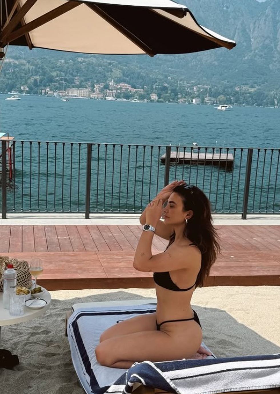 Në imazhet e publikuara në Instagram, Liberta shfaqet e veshur me një palë bikini minimaliste ngjyrë të zezë, ndërsa pozon pranë një pishine me sfondin mahnitës të liqenit dhe maleve përreth.