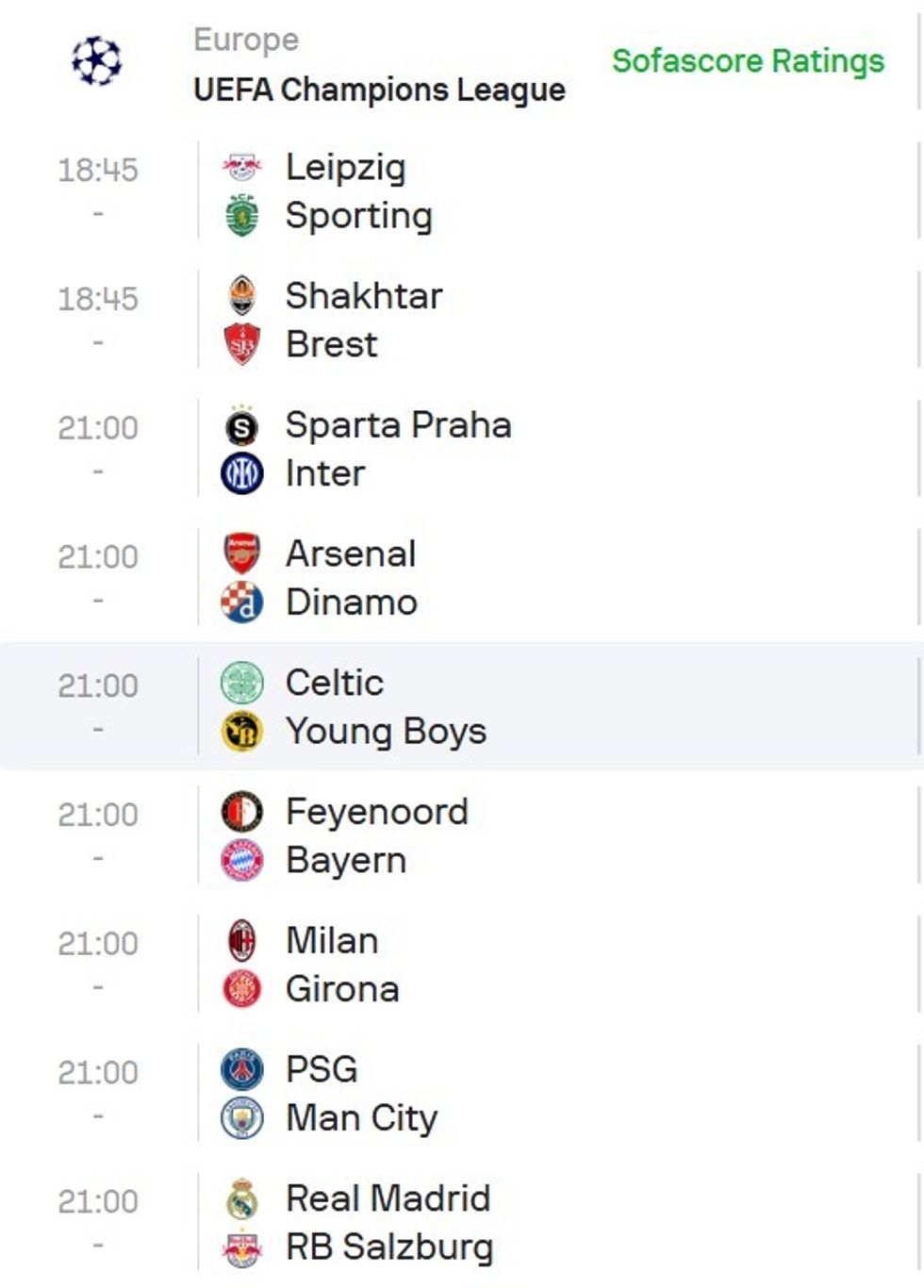 Në tri takimet tjera të mbrëmjes, RB Leipzig luan në shtëpi ndaj Sporting Lisbonës, Shakhtari Donetsk-Brest dhe Celtic-Young Boys.