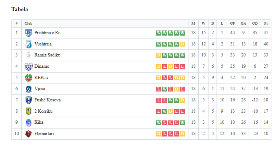 Dinamo e Ferizajt është e katërta me 27 pikë, ndërsa KEK-u tani ka 24 pikë në vendin e pestë. Vjosa është e gjashta me 19 pikë, ndërsa Fushë Kosova me 18 pikë është e shtata.