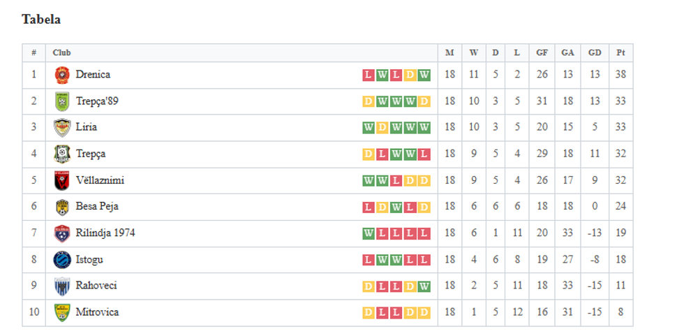 Drenica tani ka 38 pikë në vendin e parë, ndërsa Trepça ‘89 dhe Liria me nga 33 pikë mbajnë pozitat dy dhe tre.