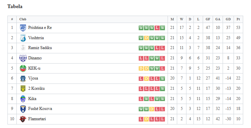 Prishtina e Re është lider me 53 pikë, ndërsa pas tyre vjen Vushtrria me 49 pikë. Në vendin e tretë është Ramiz Sadiku me 36 pikë, ndërsa në vendin e katërt qëndron Dinamo me 33 pikë.