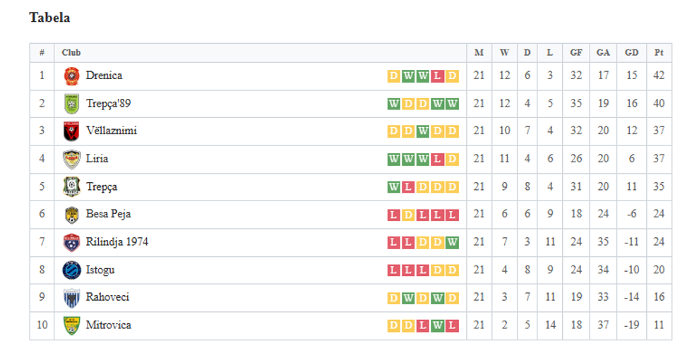 Drenica aktualisht është lider me 42 pikë, ndërsa tani Trepça ‘89 është e dyta me 40 pikë.