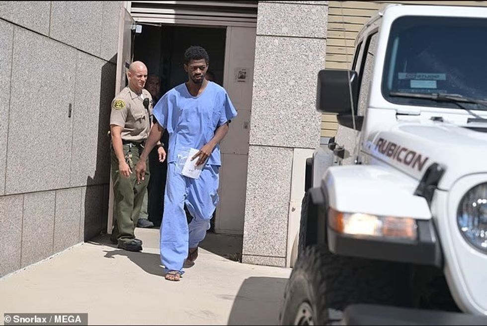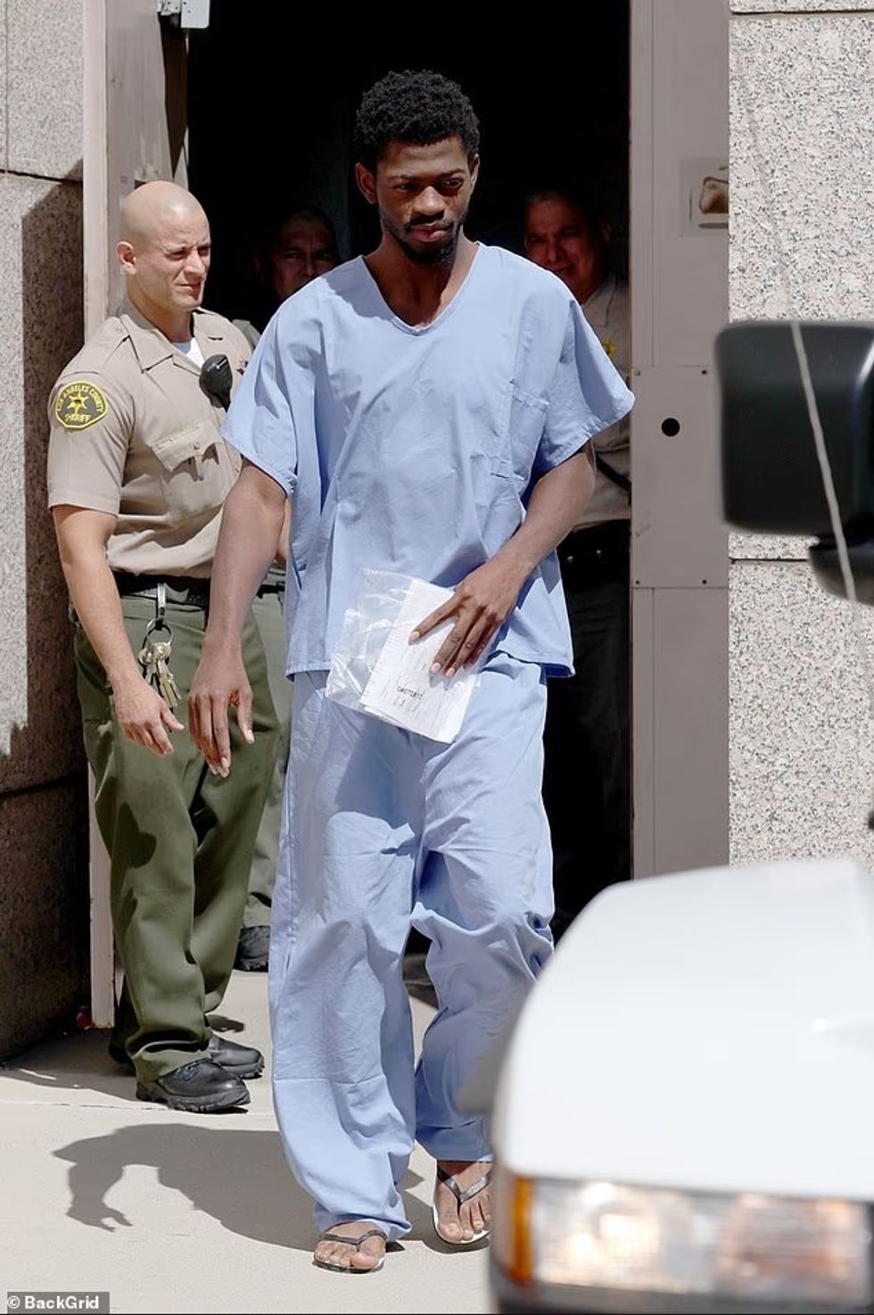 Ai u pa duke dalë nga gjykata në Van Nuys, Kaliforni, me një kostum burgu blu dhe sandale, duke mbajtur disa dokumente në dorë.