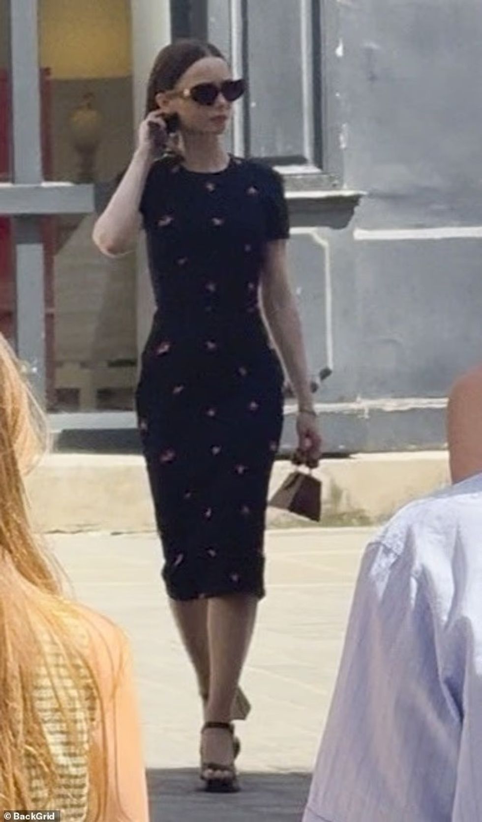 Lily Collins duket elegante si gjithmonë me një fustan të ngushtë deri poshtë gjurit teksa xhiron skena për sezonin e pestë të “Emily in Paris”