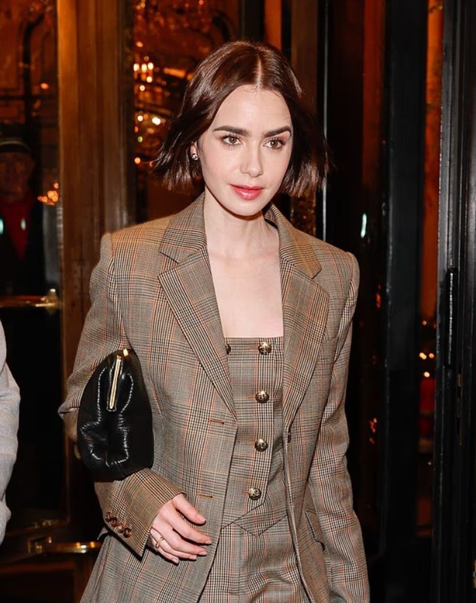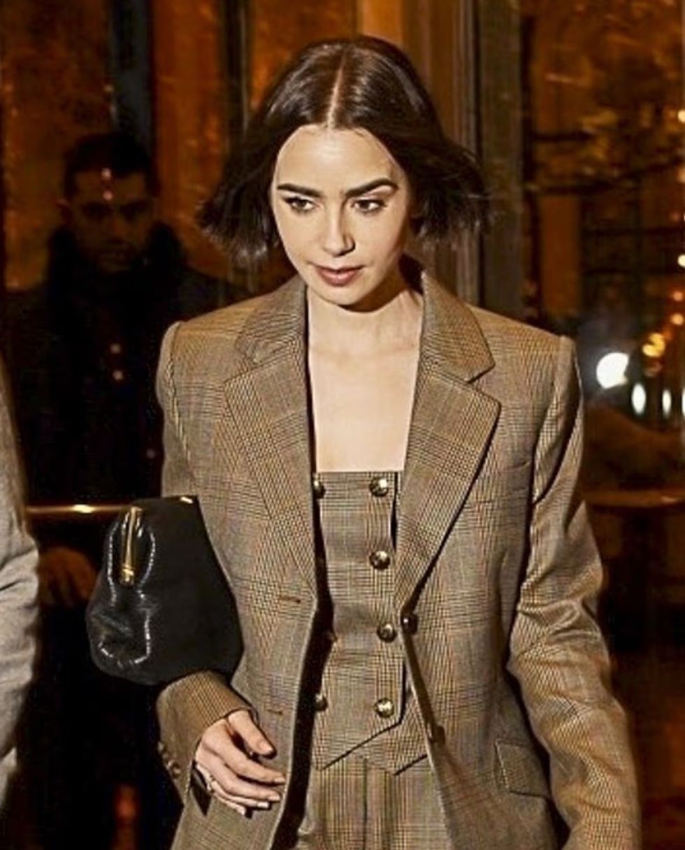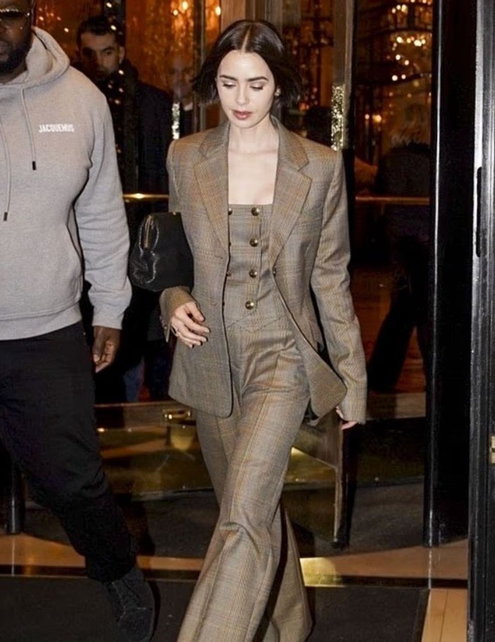 Lily doli nga hoteli i saj në Paris me një kostum tre pjesësh me katrorë, dhe u shoqërua nga bashkë-ylli i saj Lucien Laviscount të dielën në mbrëmje.