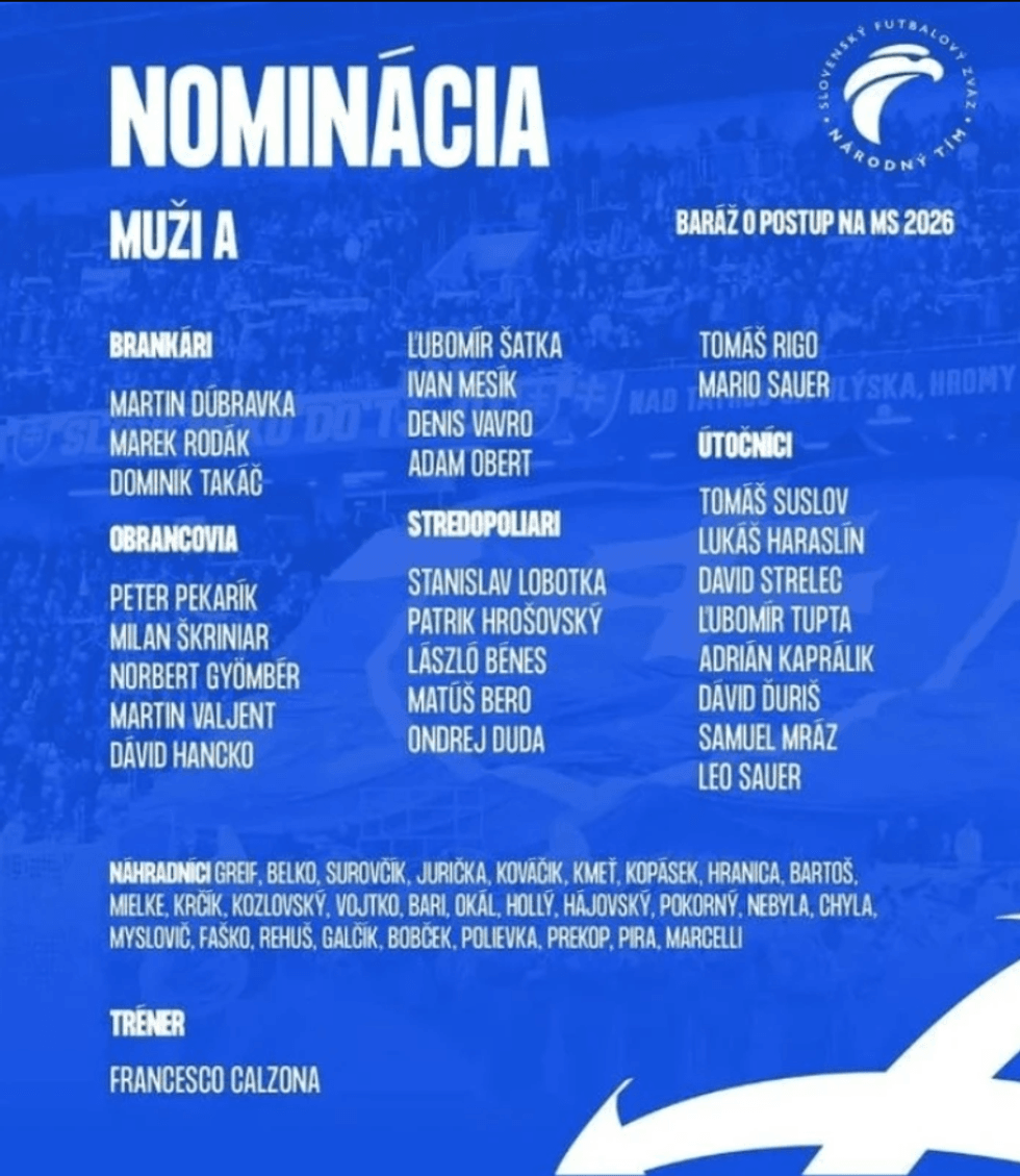Përzgjedhësi i Sllovakisë, Francesco Calzona, ka publikuar të enjte(19 mars) listën e lojtarëve të ftuar për ndeshjen e rëndësishme kundër Kosova.