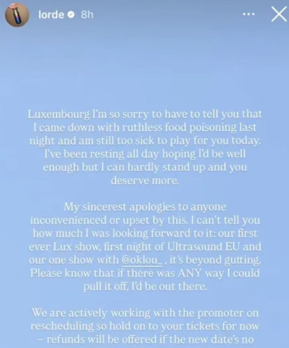 Këngëtarja e njohur neozelandeze, Lorde, u detyrua të anulonte koncertin e saj në Rockhal të Luksemburgut vetëm disa orë para se të dilte në skenë, pasi u sëmur rëndë nga helmimi me ushqim.