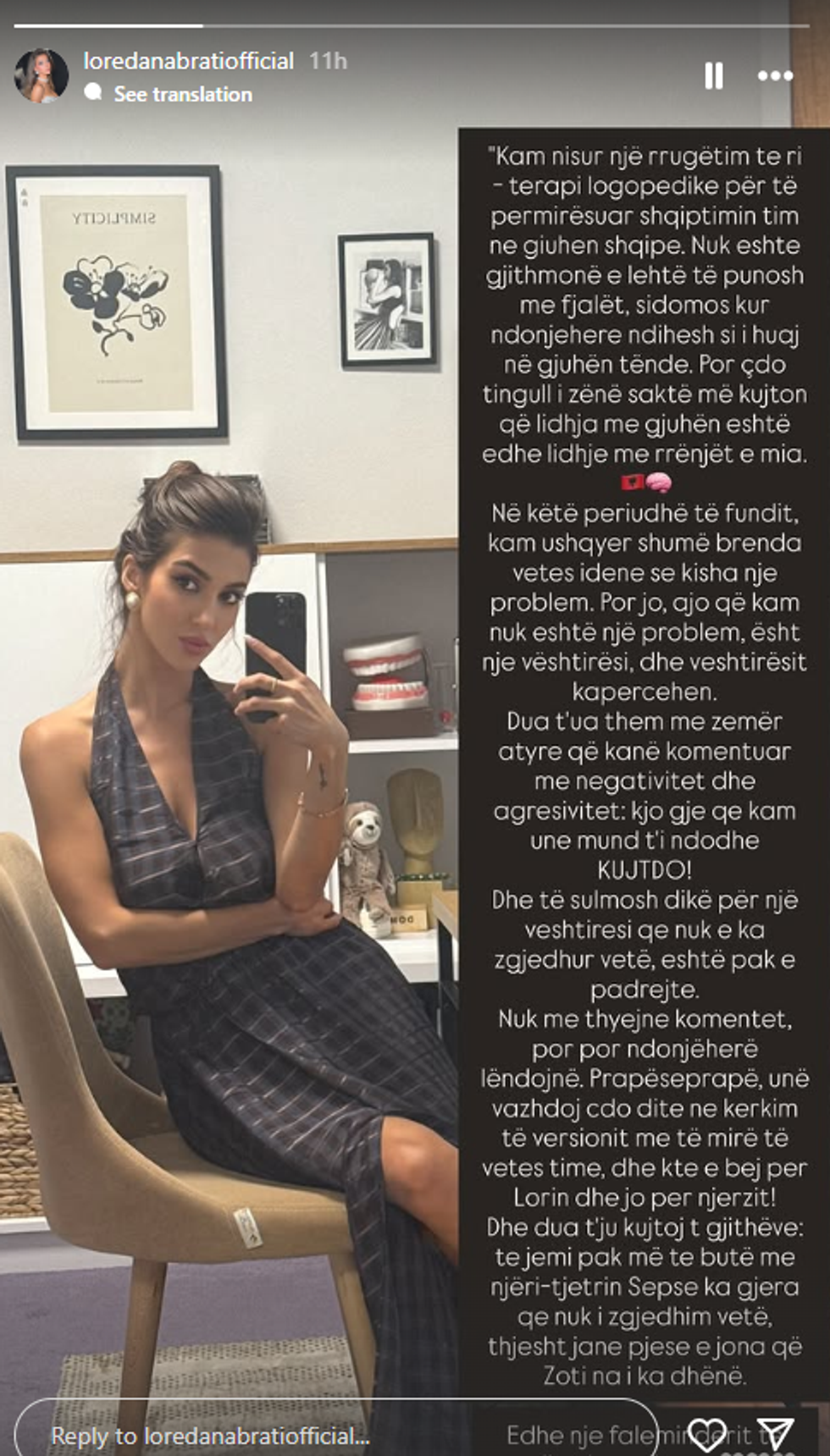 “Është e vështirë të kapësh fjalët, sidomos kur ndonjëherë ndihesh si i huaj në gjuhën tënde. Por çdo tingull i shprehur saktë më rikthen tek rrënjët e mia dhe lidhja me gjuhën time”, shprehet Loredana në postim.