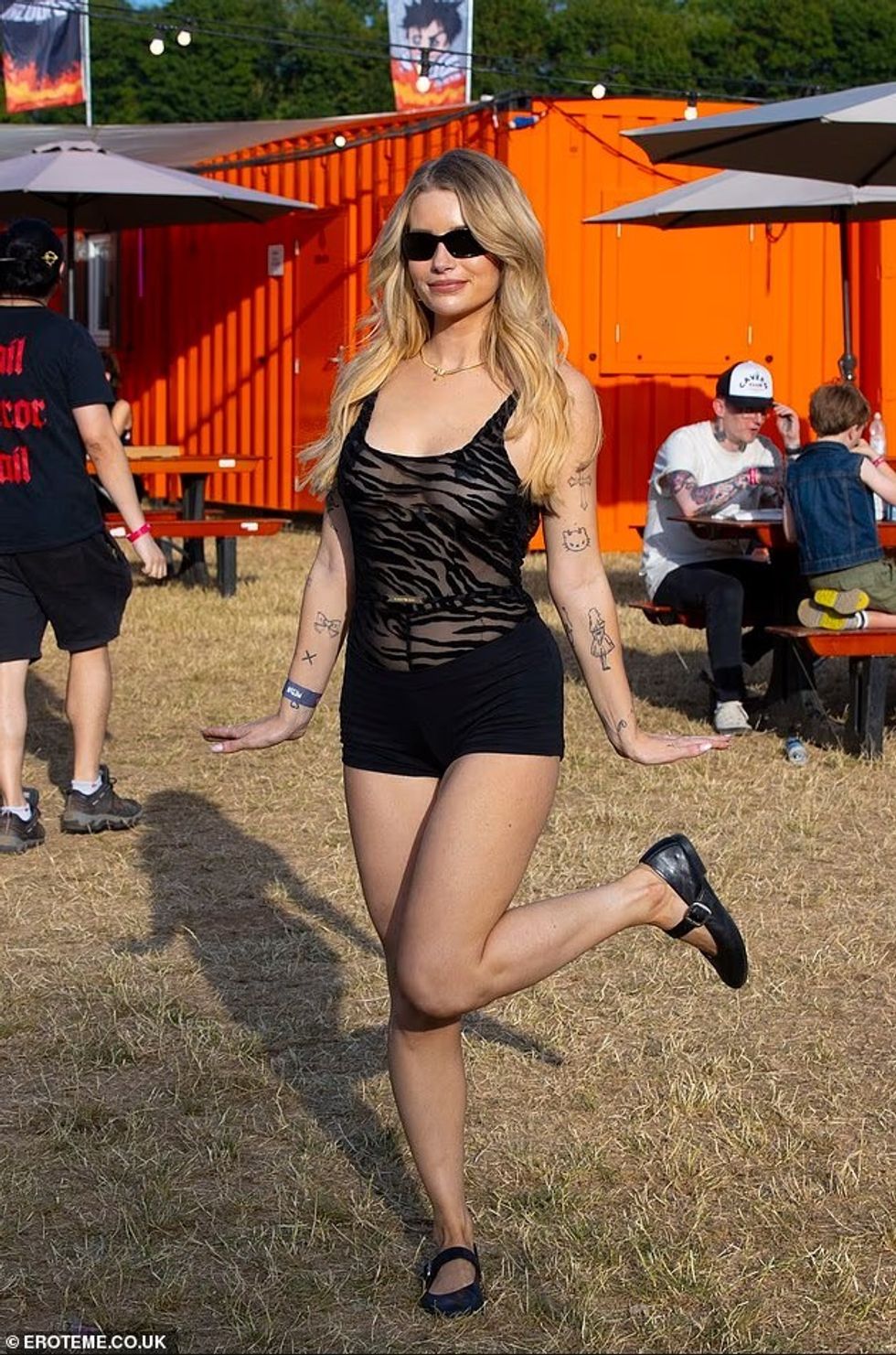 Modelja britanike, Lottie Moss, ndezi skenën këtë fundjavë në Festivalin BludFest, ku u shfaq me një kostum trupi rrjete transparent dhe pantallona të shkurta që vënë në pah linjat e saj.