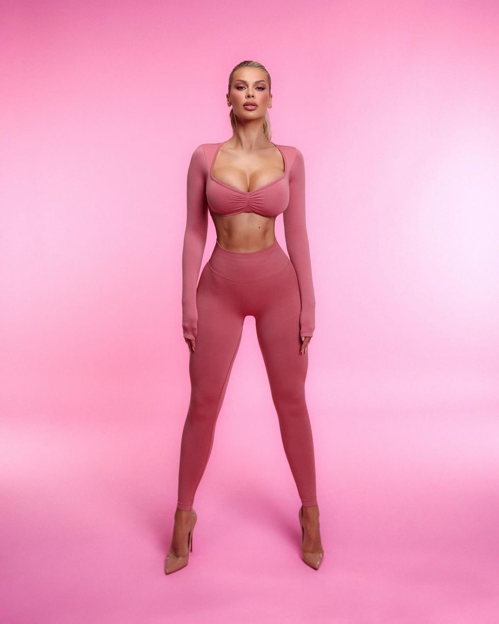 E veshur me një komplet sportiv ngjyrë rozë dhe me një sfond të njëjtë minimalist, Luana ka pozuar me vetëbesim të plotë, duke vënë në pah format trupore dhe linjat elegante.