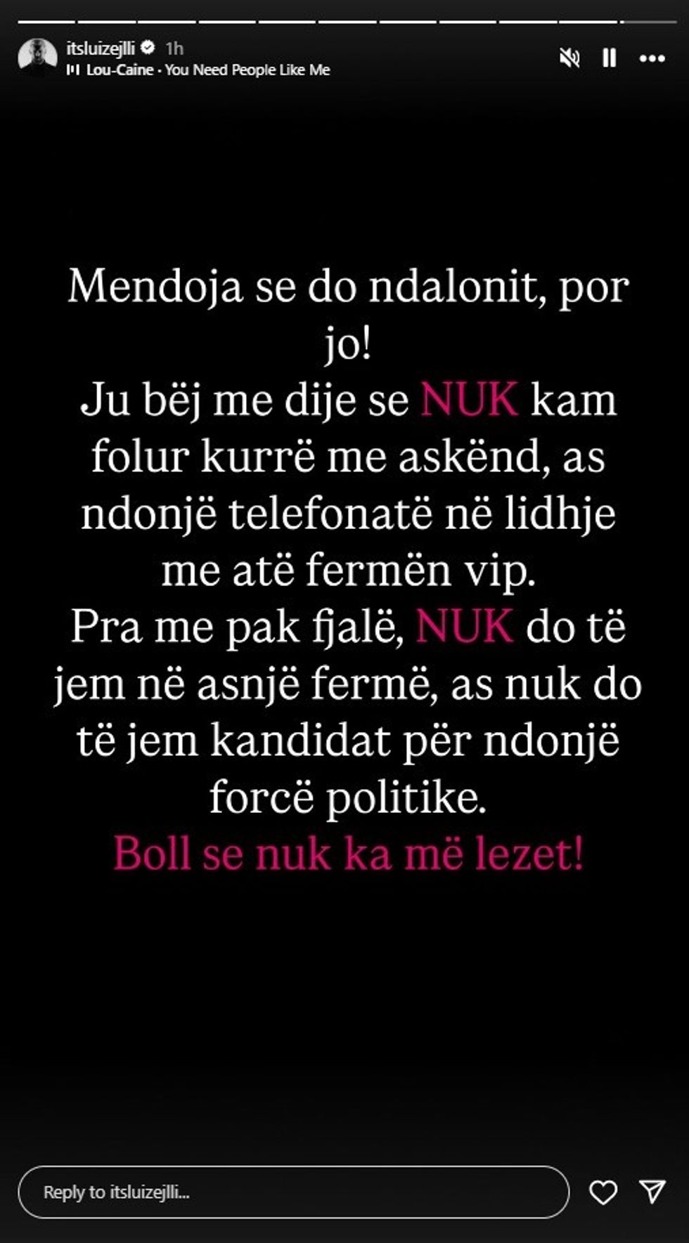Në një postim të qartë dhe të prerë në InstaStory, ai mohoi çdo përfshirje në formatin televiziv “Ferma VIP” dhe gjithashtu përfshirjen e tij në politikë.