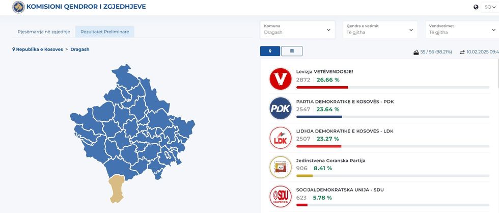 Rezultatet preliminare të KQZ-së për zgjedhjet për Kuvendin e Kosovës tregojnë se Lëvizja Vetëvendosje në Dragash ka një epërsi të votave krahasuar me PDK-në dhe LDK-në.