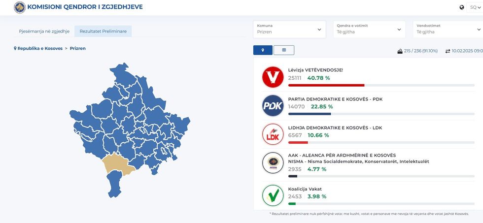 Rezultatet preliminare të KQZ-së për zgjedhjet për Kuvendin e Kosovës tregojnë se Lëvizja Vetëvendosje në Prizren prinë me vota në raport me subjektet tjera politike.