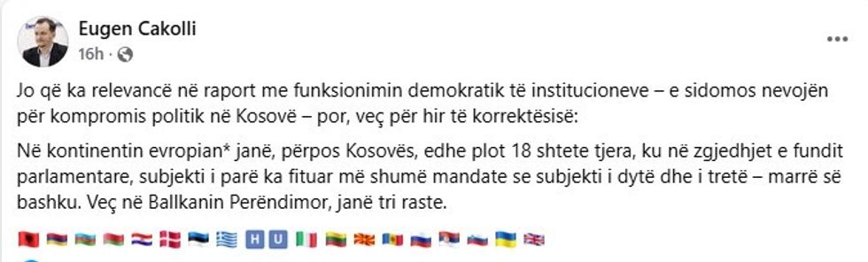 “Ka plot shtete në Evropë ku partia e parë ka më shumë deputetë se e dyta dhe e treta bashkë”, u shpreh Cakolli.