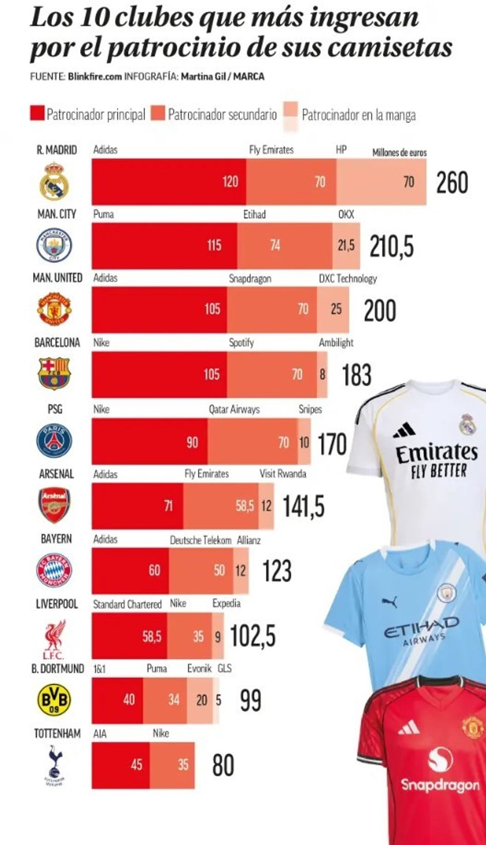 Megjithatë, sipas gazetës Marca, Real Madridi vazhdon të mbetet ‘mbret’ i përfitimeve nga fanella, pasi fiton një total prej 260 milionë eurosh, ku 120 milionë në vit vijnë nga Adidasi dhe nga 70 milionë euro nga kompanitë Fly Emirates dhe HP që i ka si sponsor.