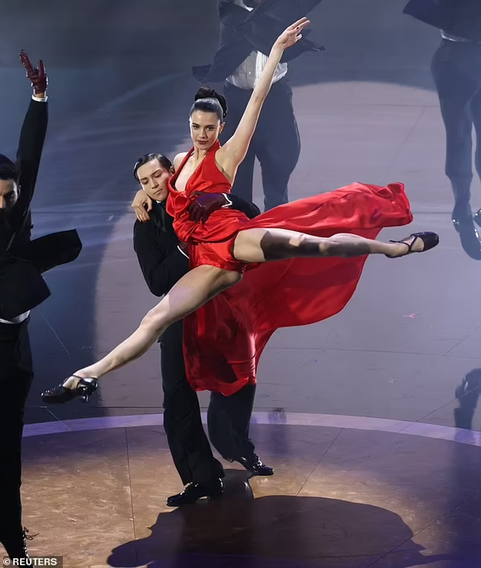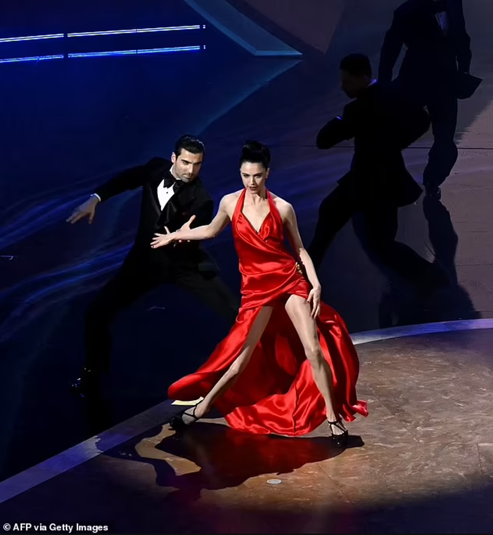 Në këtë moment, Margaret Qualley, doli në skenë me një fustan të kuq saten me një dekolte të thellë dhe një të çarë të guximshme deri në kofshë, duke dhuruar një performancë që elektrizoi publikun. Kërcimi i saj dinamik, i realizuar me një koreografi të sofistikuar dhe të shoqëruar nga një grup balerinësh elegantë, u bë një nga momentet më të komentuara të mbrëmjes.