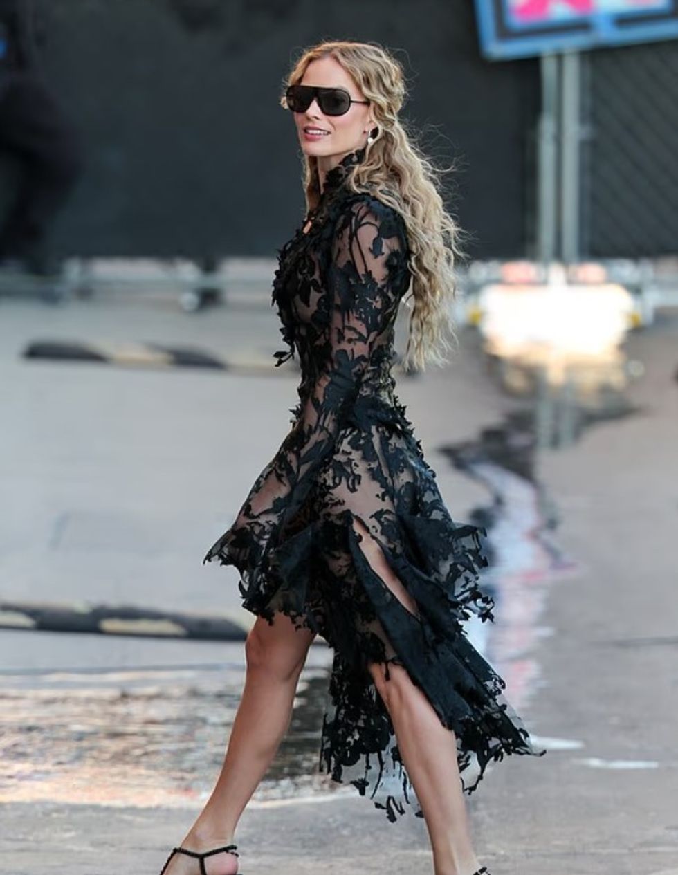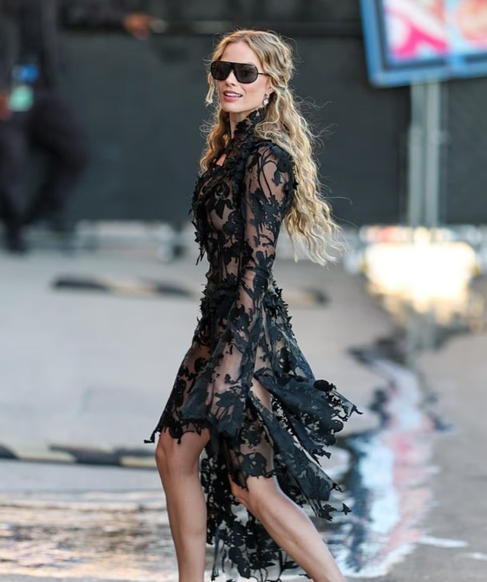 Aktorja 35-vjeçare, e cila luan përkrah Jacob Elordi si Heathcliff, veshi një fustan dramatik të zi transparent me dantella, të kombinuar me taka të larta dhe syze të errëta.