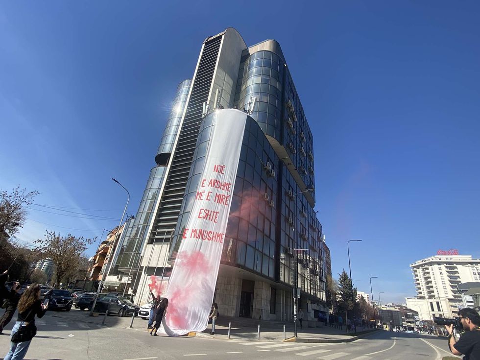 "Marshojmë s'festojmë", pjesëmarrësit hedhin ngjyrë të kuqe e tymuese para objektit të policisë dhe gjykatës