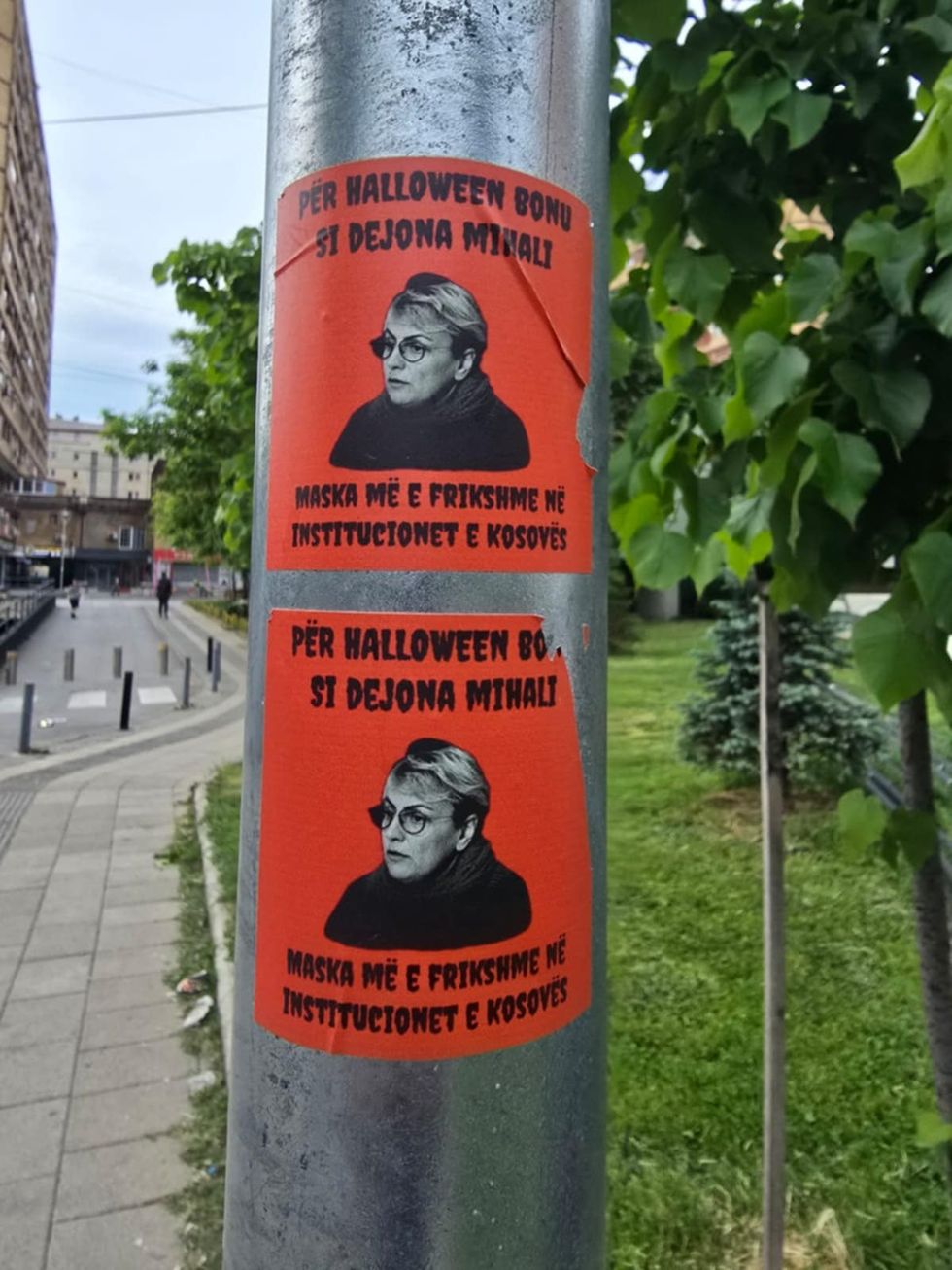 “Për Halloween bonu si Dejona… Maska më e frikshme në institucionet e Kosovës”, thuhet në afishen që është vendosur në disa lokacione të kësaj rruge.
