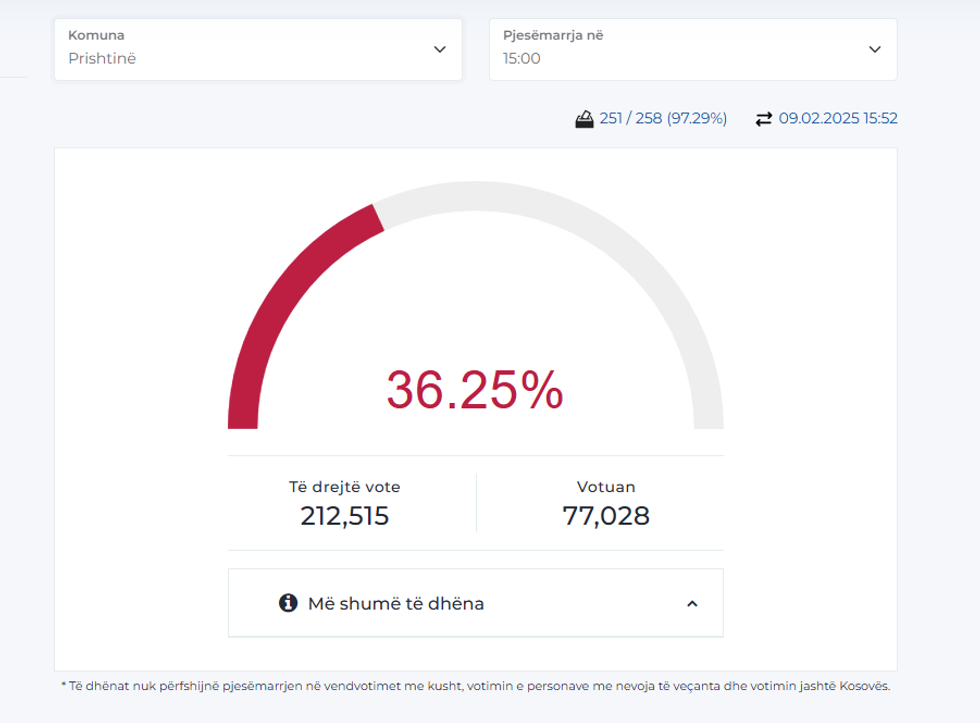Të dhënat e fundit nga Komisioni Qendror i Zgjedhjeve, tregojnë se në Prishtinë deri në ora 15:00 kanë votuar 79 mijë e 121 qytetarë.