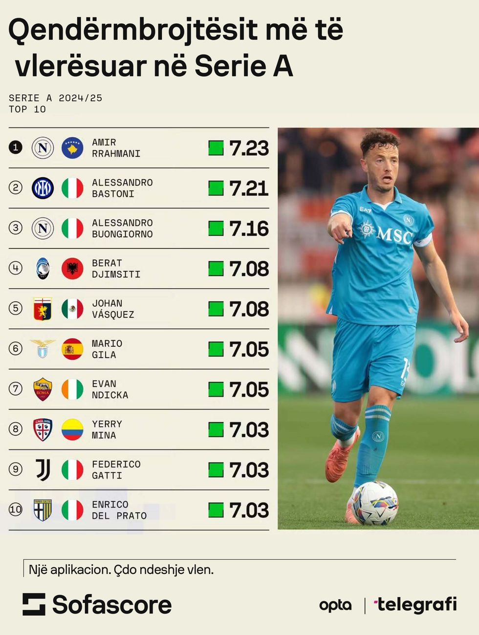 Menjëherë pas Rrahmanit është Alessandro Bastoni i Interit me notë 7,21, derisa Alessandro Buongiorno i Napolit vlerësohet 7,16.