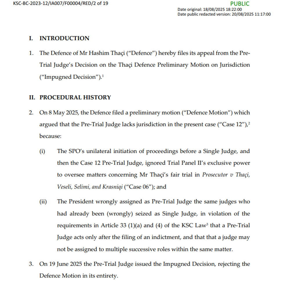 Mbrojtja e ish-presidentit Hashim Thaçi, ka dorëzuar më 18 gusht 2025 një kërkesë ndaj vendimit të Gjykatës Speciale lidhur me kompetencën për të shqyrtuar Rastin 12, që lidhet me akuzën për pengim të drejtësisë.