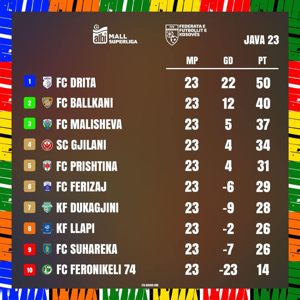 Janë mbyllur të gjitha ndeshjet e javës së 23-të në Superligën e Kosovës, ku nuk munguan rezultatet befasuese dhe lëvizjet në renditje.