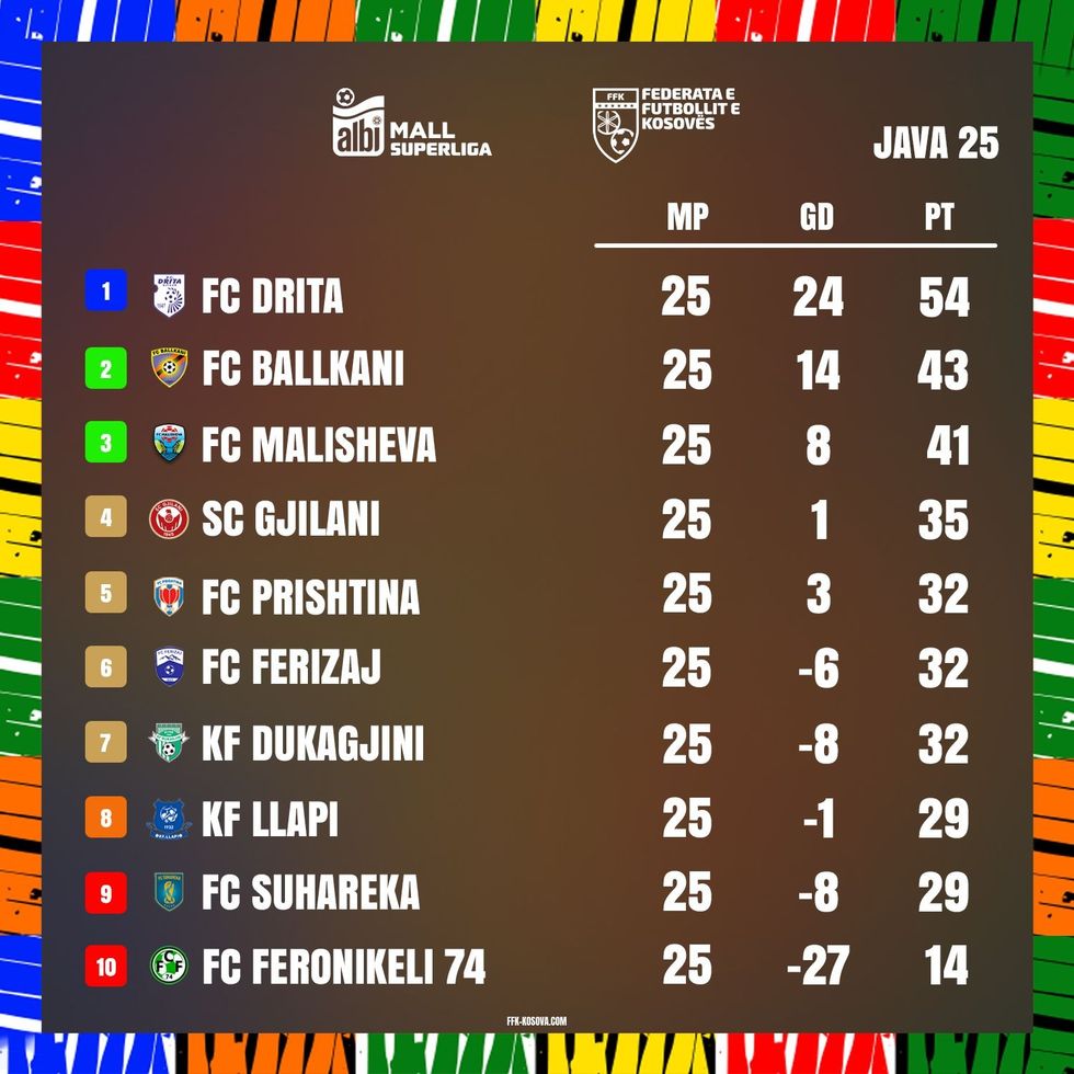 Drita mbetet lider me 54 pikë, që vazhdon të ndiqet nga Ballkani që ka 43 pikë.