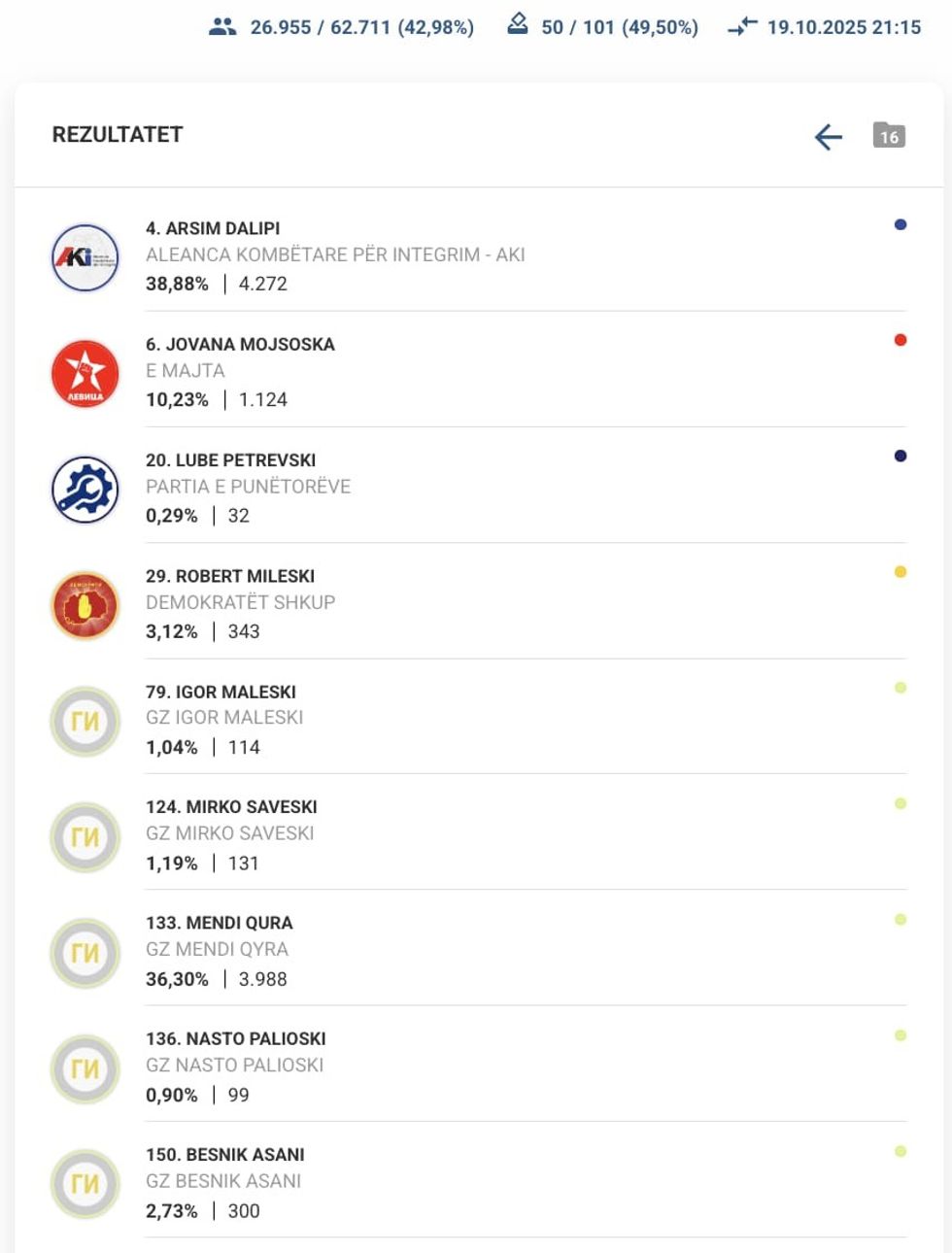Sipas KSHZ-së, nga 42,98% vota të numëruara, rezultatet janë si më poshtë: