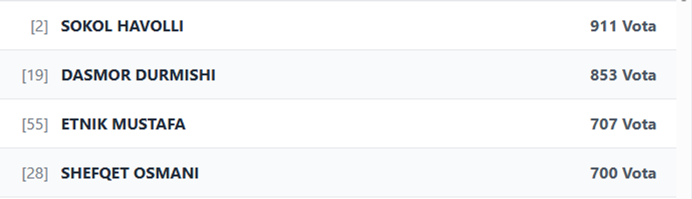 Përparim Rama si bartës i listës ka marrë plotë 28,969 vota, derisa pas tij renditen Bujar Gashi, Bekim Gashi, Milazim Vitija, Fadil Aliu, Egzon Pacolli, Sokol Havolli, Dasmor Durmishi, Etnik Mustafa dhe Shefqet Osmani në Top 10-she.