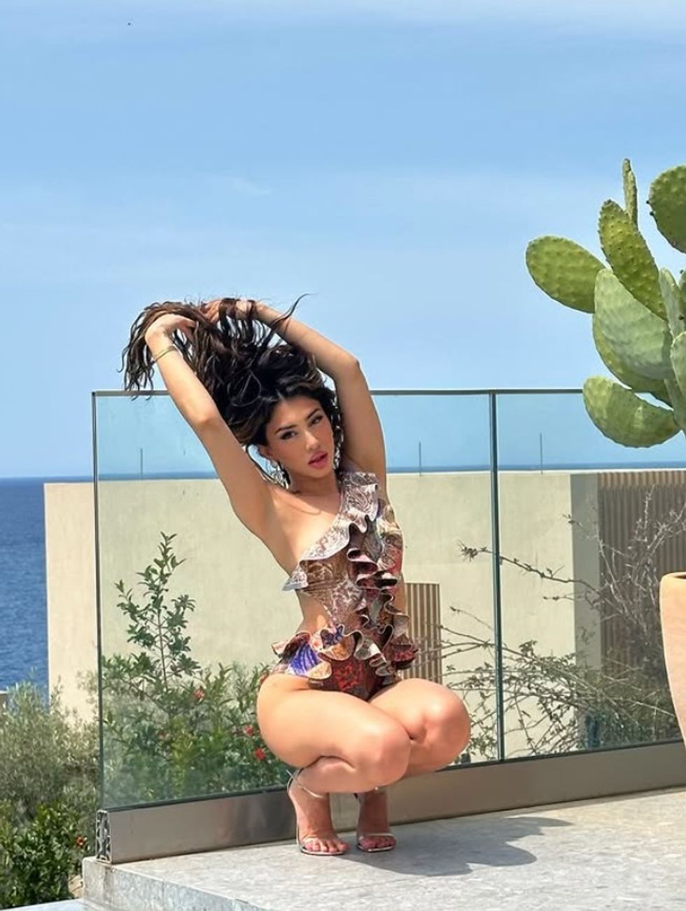E veshur me rrobabanje me motive boho dhe prerje të theksuara anësore, këngëtarja duket mahnitëse teksa pozohet në një sfond përrallor, me detin dhe pishinën që ndërthuren në mënyrë perfekte me bukurinë e saj natyrale.