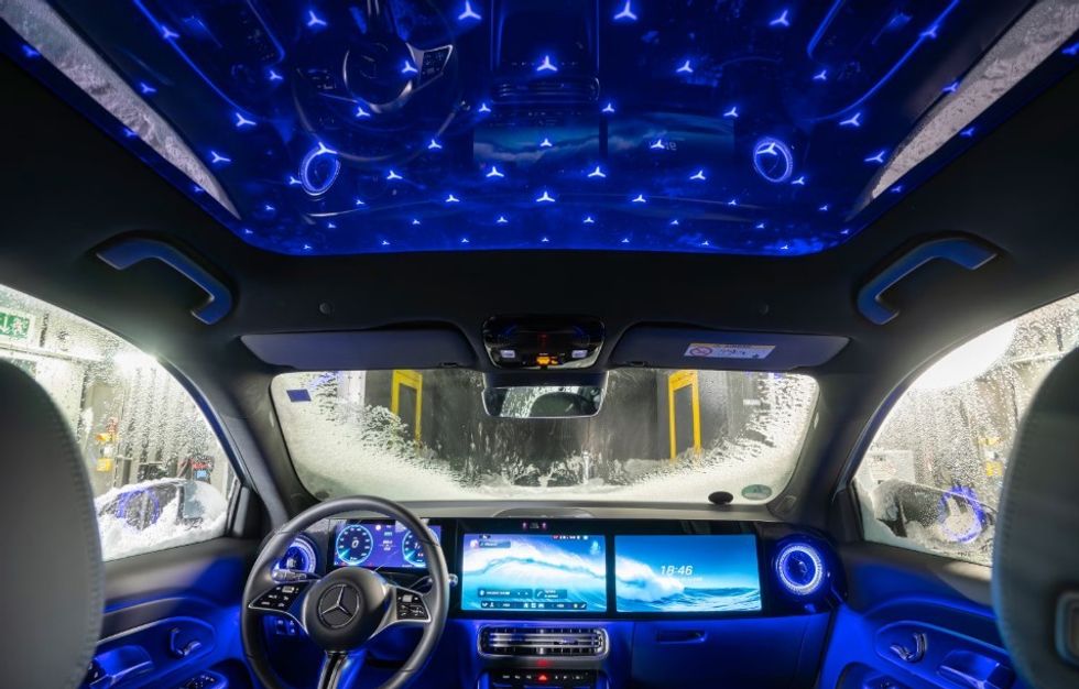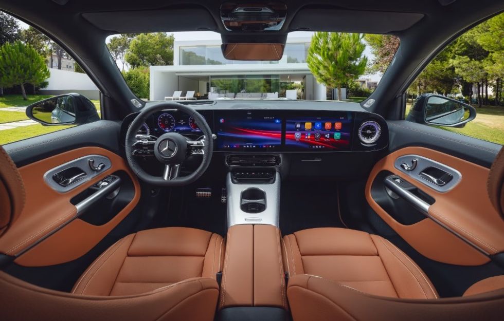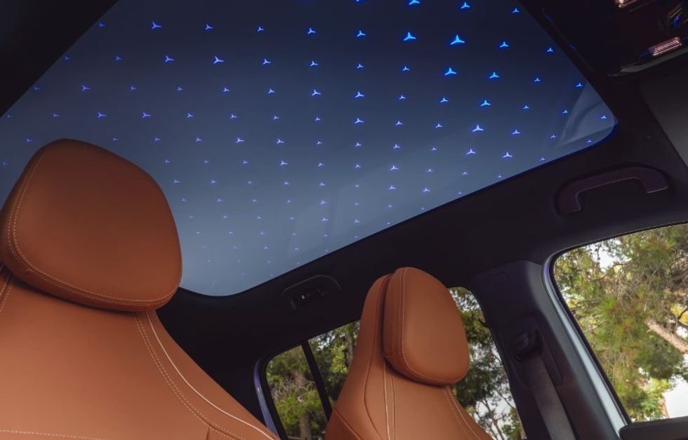 Mercedes reklamon më shumë hapësirë për kokën për dy rreshtat e parë, me GLB EV që vjen standard me një çati xhami panoramike që paraqet një model ylli të ndriçuar opsional dhe aftësinë për të kaluar nga transparente në të errët me shtypjen e një butoni.